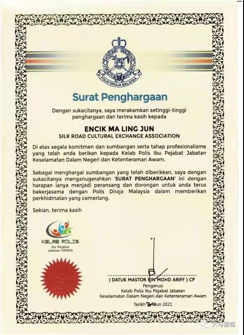 我会马领军副会长于近日收到马来西亚皇家警察总部俱乐部国内安全和公共秩序部的感谢状, 拿督莫哈末阿里夫主席对马领军先生为该俱乐部做出的支持表示感谢。